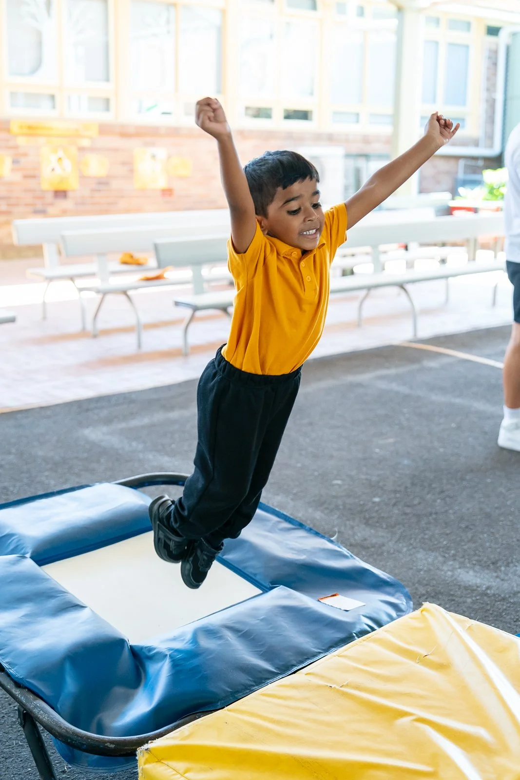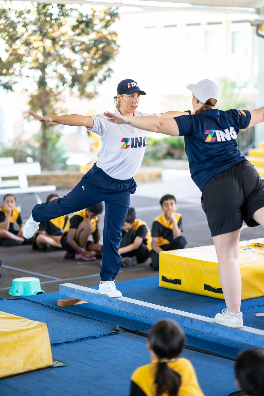 Students are challenged with gymnastics and fitness equipment to roll, jump, stretch and balance.